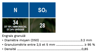 - La formule N34 + SO3 28 : Pour des besoins plus soutenus en soufre, avec 34 unités d'azote (dont 10% ammoniacal et 24% uréique) et 28 unités de soufre. Sa densité est de 0,85.