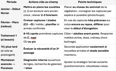 Objectif : tuer les adultes avant la ponte. Intervenir 8 à 10 jours après les premières captures significatives, sauf si le colza est encore au repos végétatif (dans ce cas, différer l’intervention).