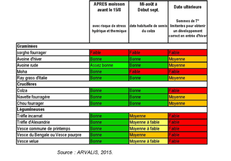 Adaptation des différentes espèces de cultures en dérobée aux dates de semis :