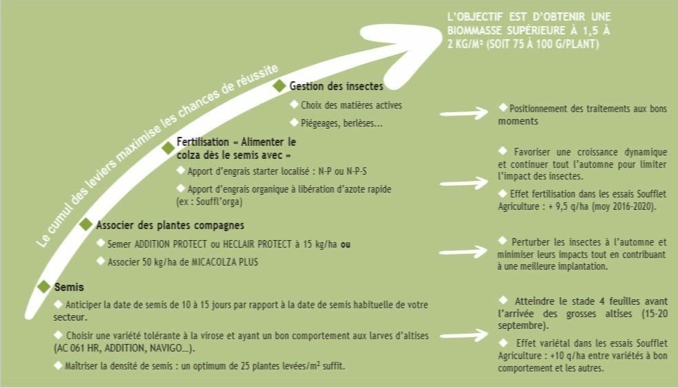 Un colza poussant avec une biomasse importante pour lutter contre la grosse altise Afin de réussir son colza, la clé est de combiner les leviers. Pour gérer les insectes d’automne, l’association des leviers agronomiques et des insecticides permet d’avoir les meilleurs résultats.