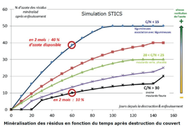 Pour maximiser le relargage d’azote à la culture suivante, il est primordial de détruire un couvert avec un C/N faible. Un mélange d’espèces avec une majorité de légumineuses permet d’atteindre cet objectif. On estime alors que 40% de l’azote emmagasiné par le couvert est minéralisé et par conséquent disponible pour la culture suivante environ 2 mois après la destruction de ce couvert (cf. graphique sur la minéralisation des résidus).