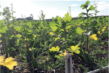 Derrière un été sec, la biomasse du couvert reste faible jusque septembre et certaines plantes à cycle court comme les crucifères montent alors à fleurs (cf. photo). Ces plantes ont alors terminé leur phase de croissance végétative. Dans ce cas, la présence d’espèces comme les vesces dans le mélange constitue une voie de relais à la production de biomasse sur octobre-novembre à la faveur d’un automne doux.