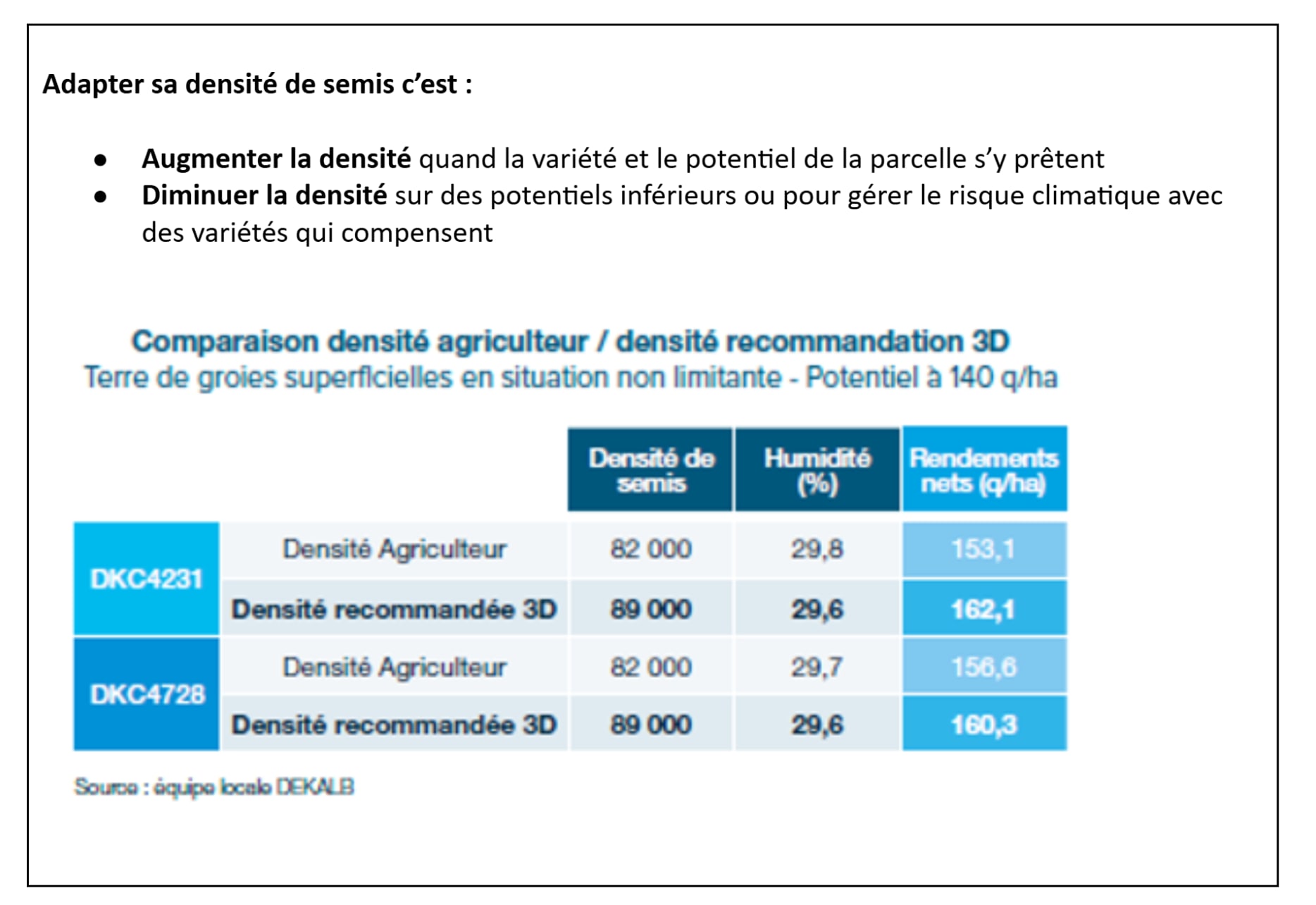 Des outils et des essais, comme ceux proposés par DEKALB®, permettent d’affiner la densité de semis et de sécuriser les investissements. Ainsi, L’application 3D de DEKALB®, calcule la meilleure densité de semis maïs, adaptée à chaque variété et en fonction de la situation agronomique de la parcelle. Pour télécharger l’application gratuitement : l'application 3D est désormais disponible sur les stores et sur Android